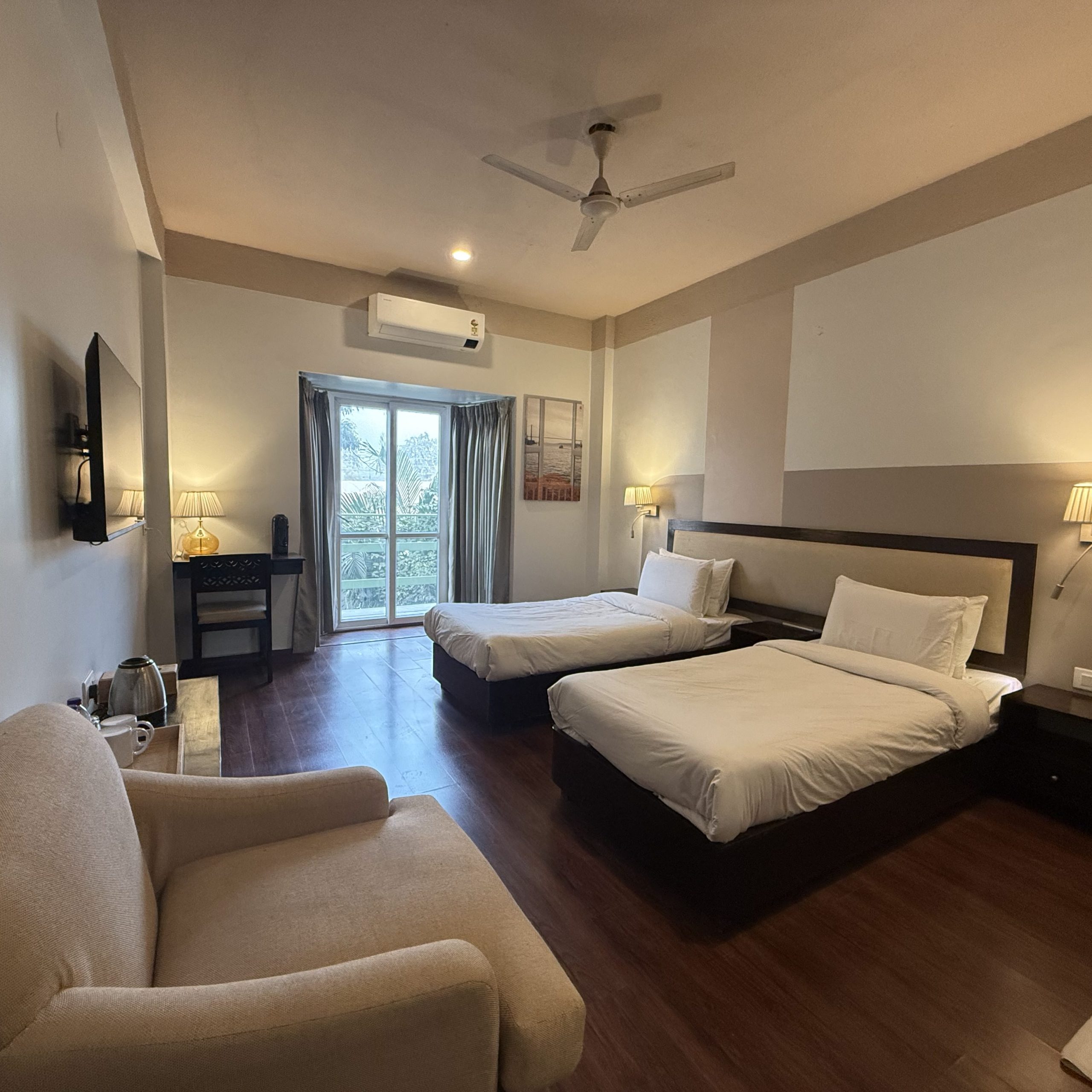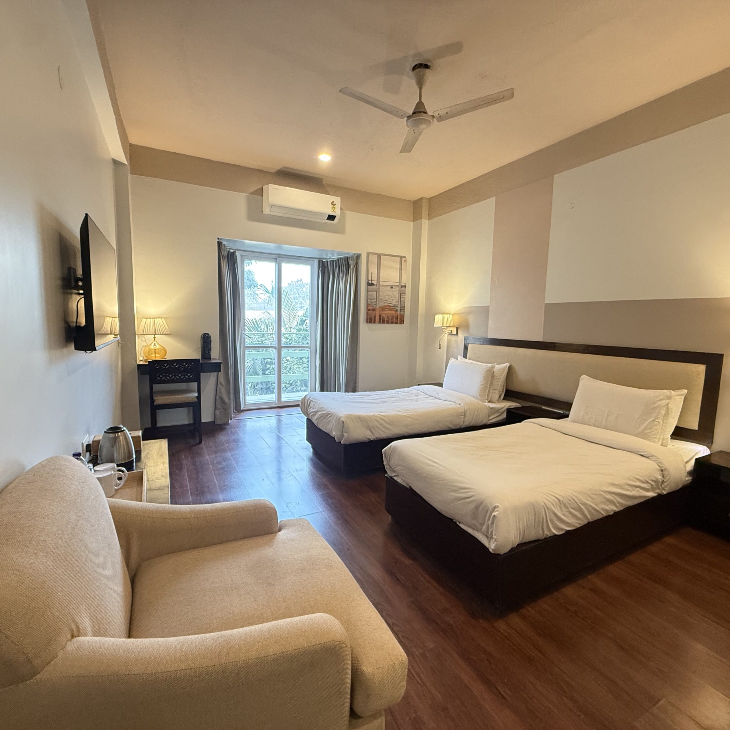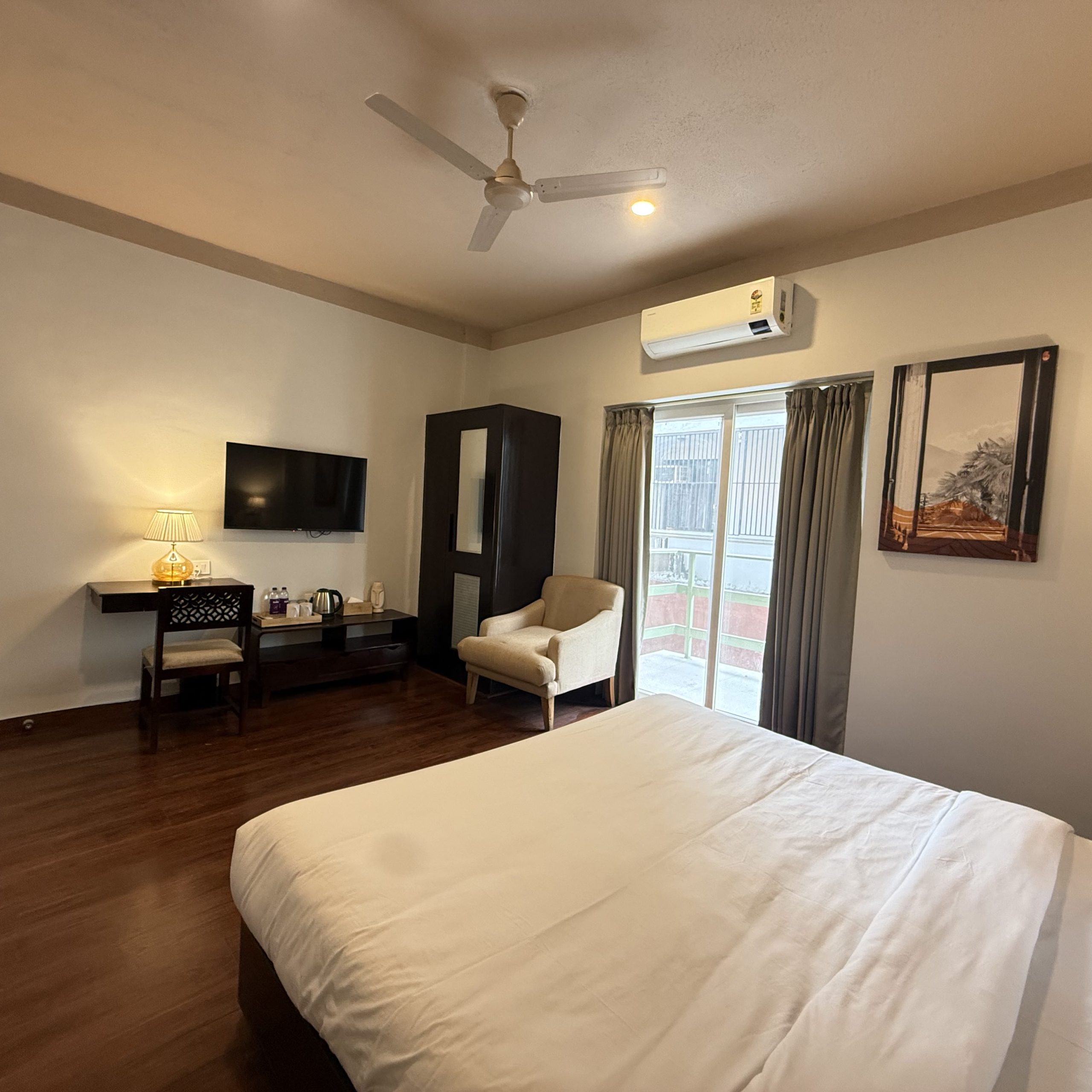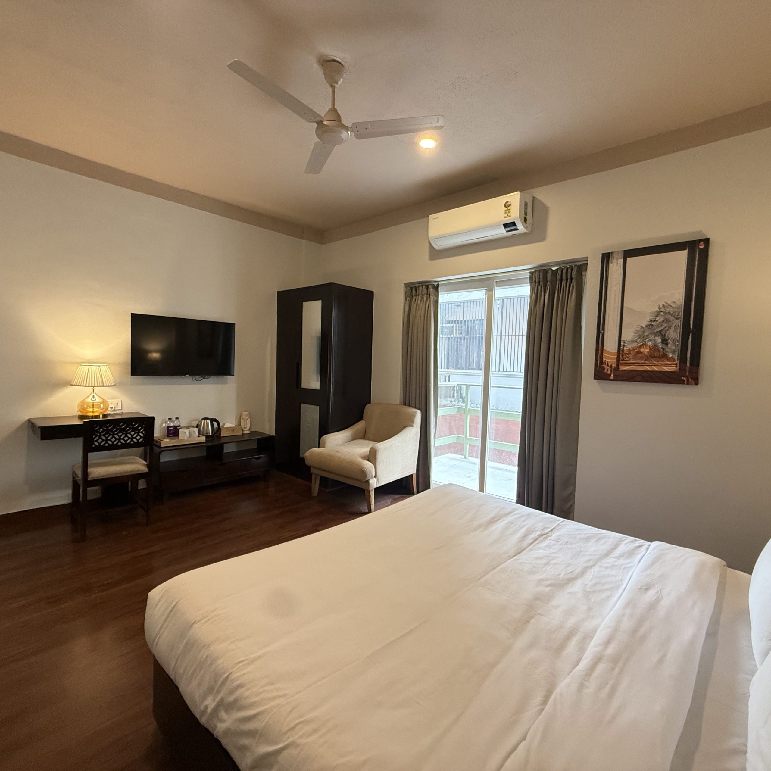Spacious, well-appointed rooms featuring warm, earthy décor, plush furnishings, a king-size bed, smart TV, all-weather air conditioning, a dedicated workspace, and modern attached bathrooms.