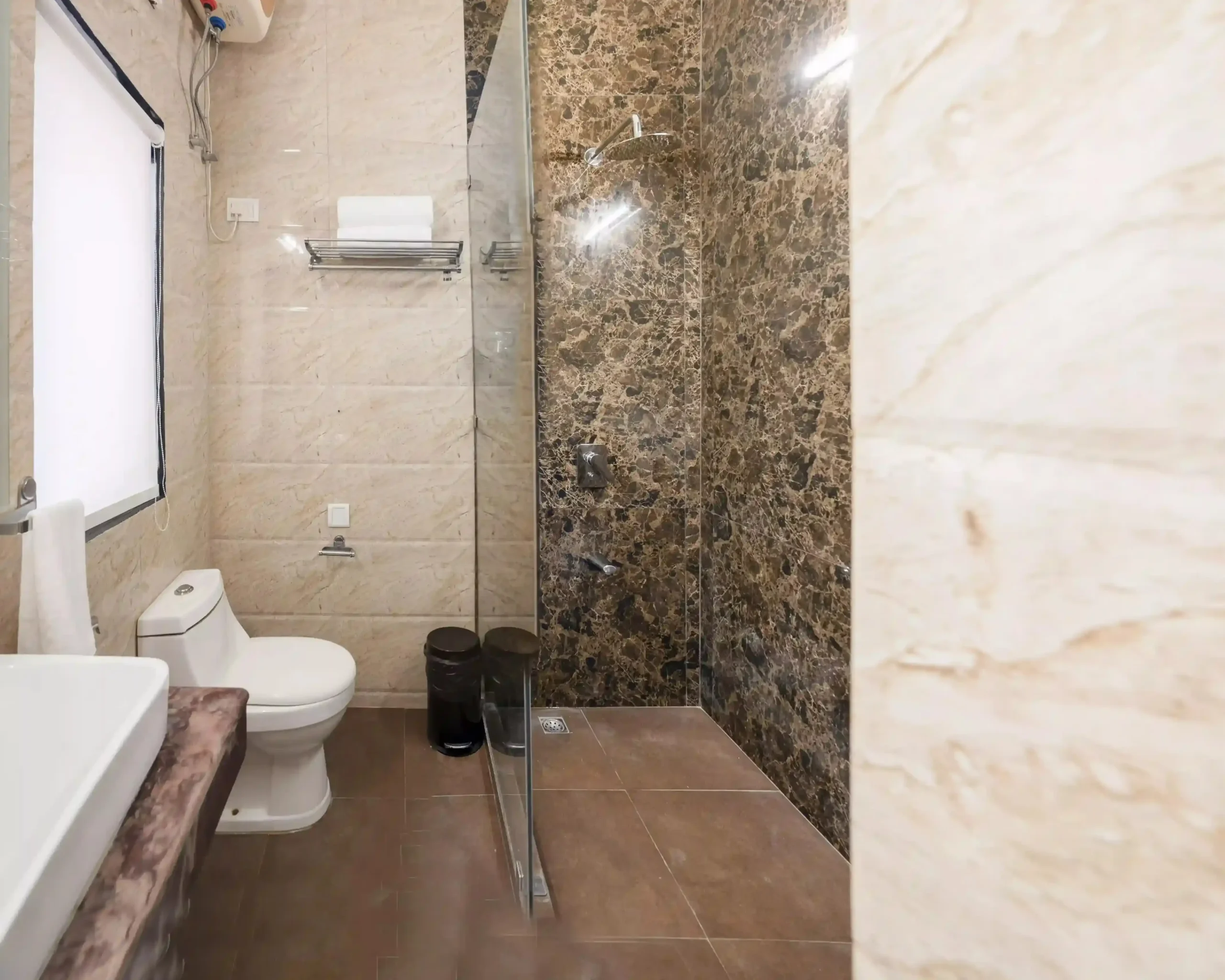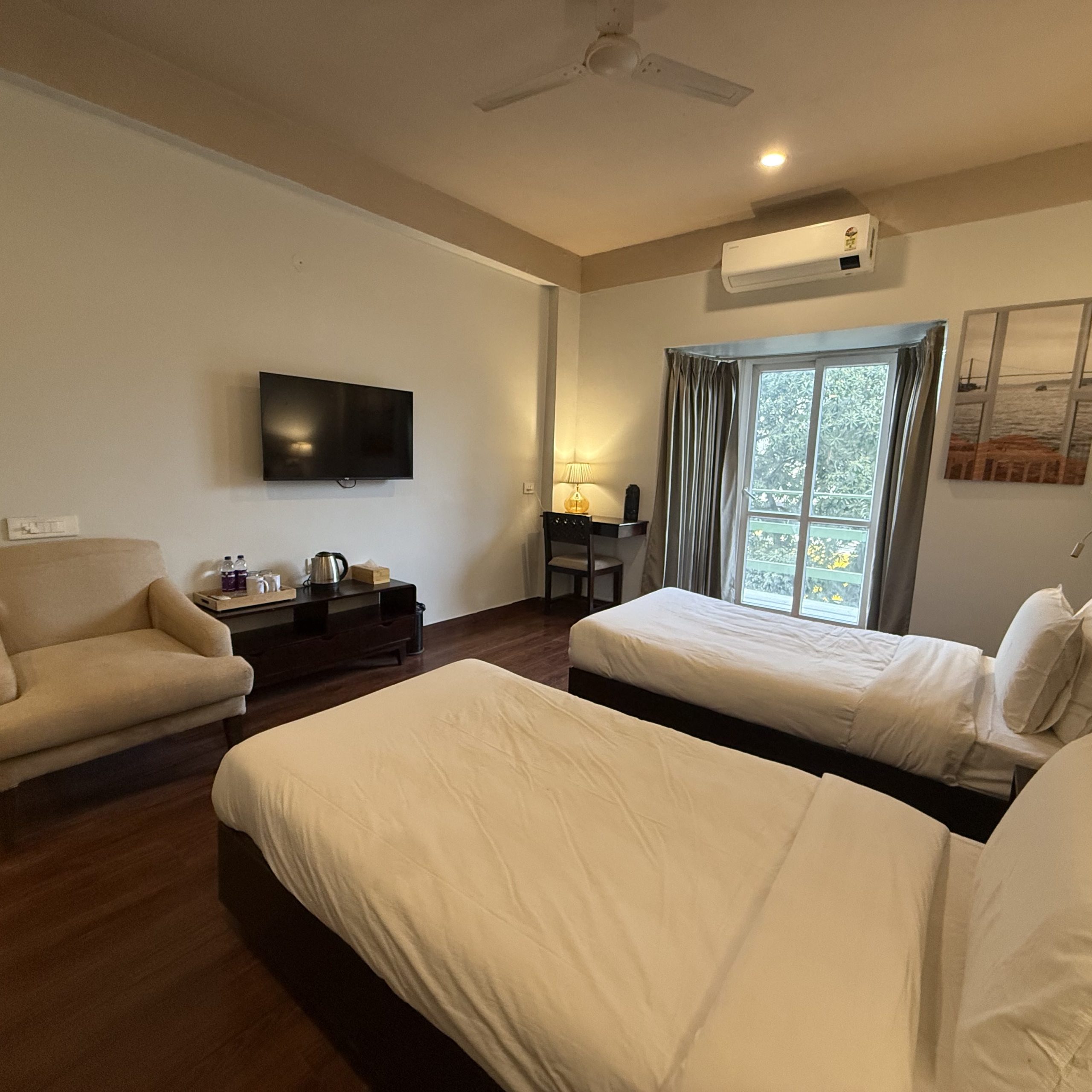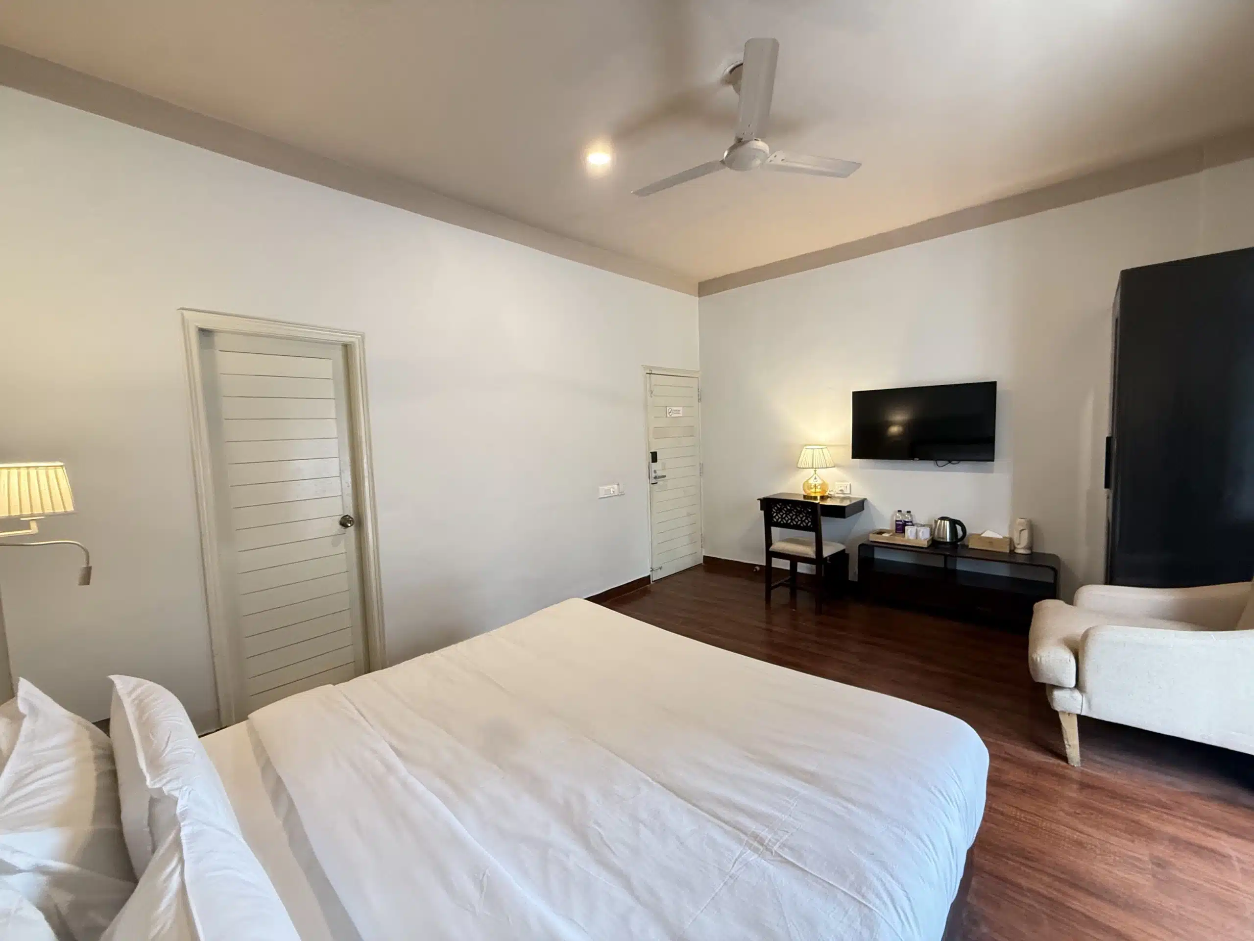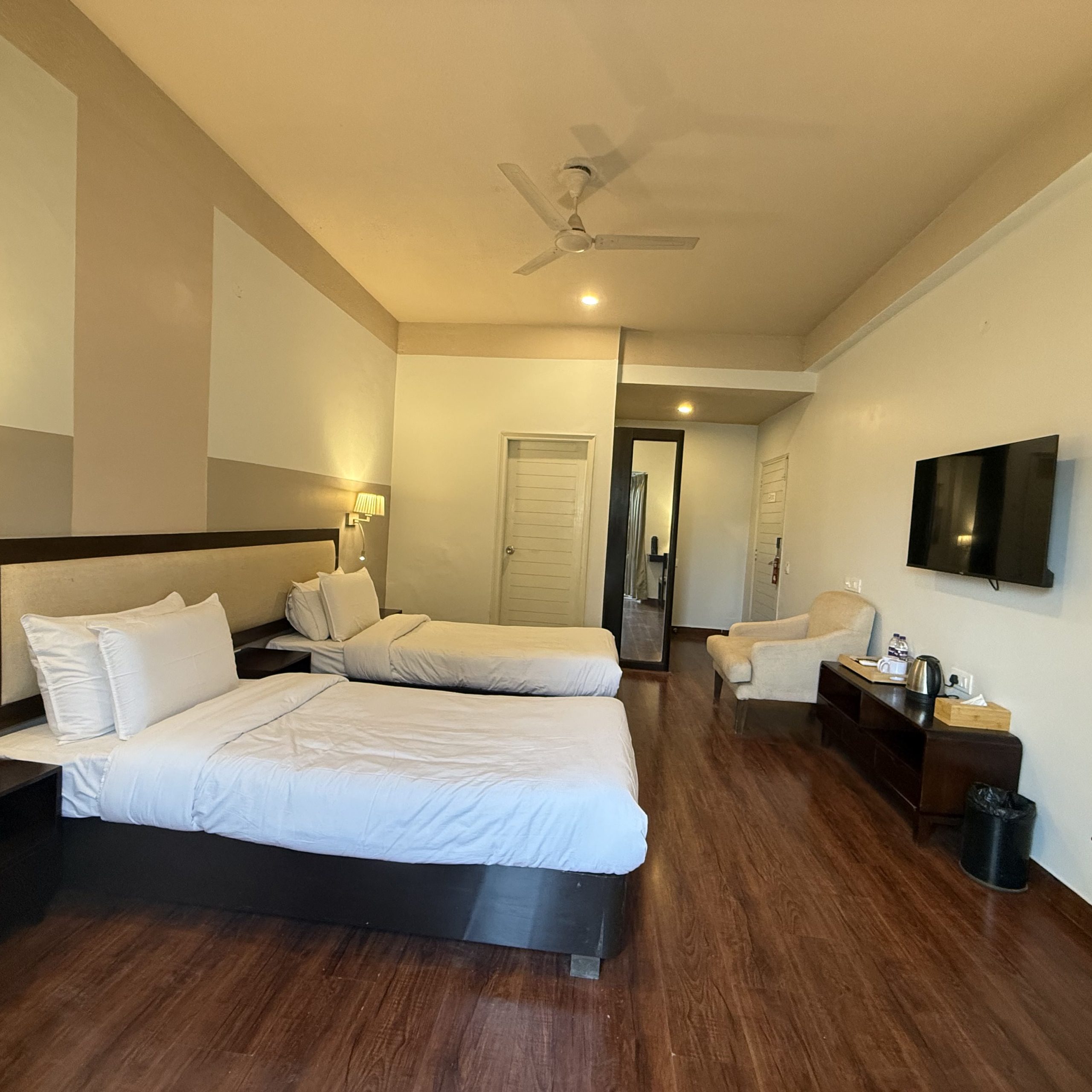 Spacious, well-appointed rooms featuring warm, earthy décor, plush furnishings, a king-size bed, smart TV, all-weather air conditioning, a dedicated workspace, and modern attached bathrooms.